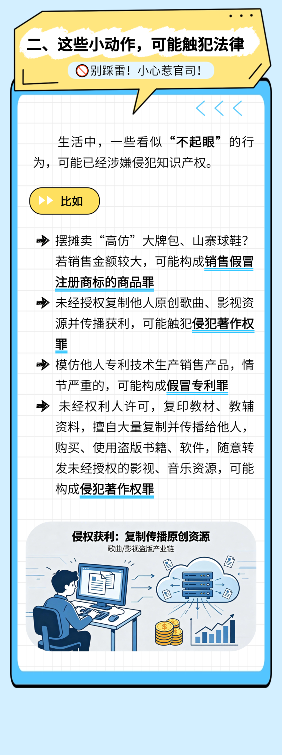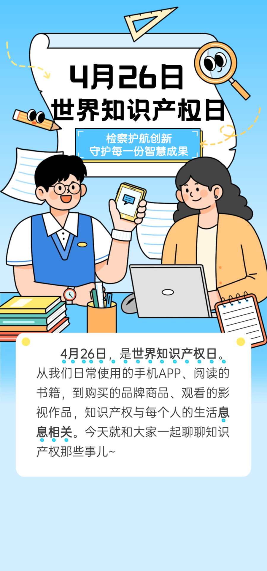 你知道吗?随手转发的一张图片、网店上一时跟风使用的LOGO,甚至是朋友圈里贩卖的“高仿”商品,都有可能让你无意间踏入知识产权的“雷区”。2026年4月26日是第26个世界知识产权日,济南市槐荫区人民检察院用最直观的方式,带你拉直知识产权保护领域的那些“问号”,手把手教你守好自己的智慧成果,也避开生活中的侵权陷阱。