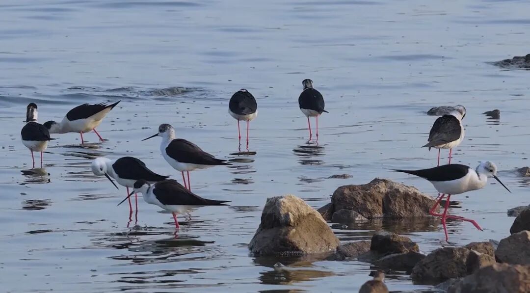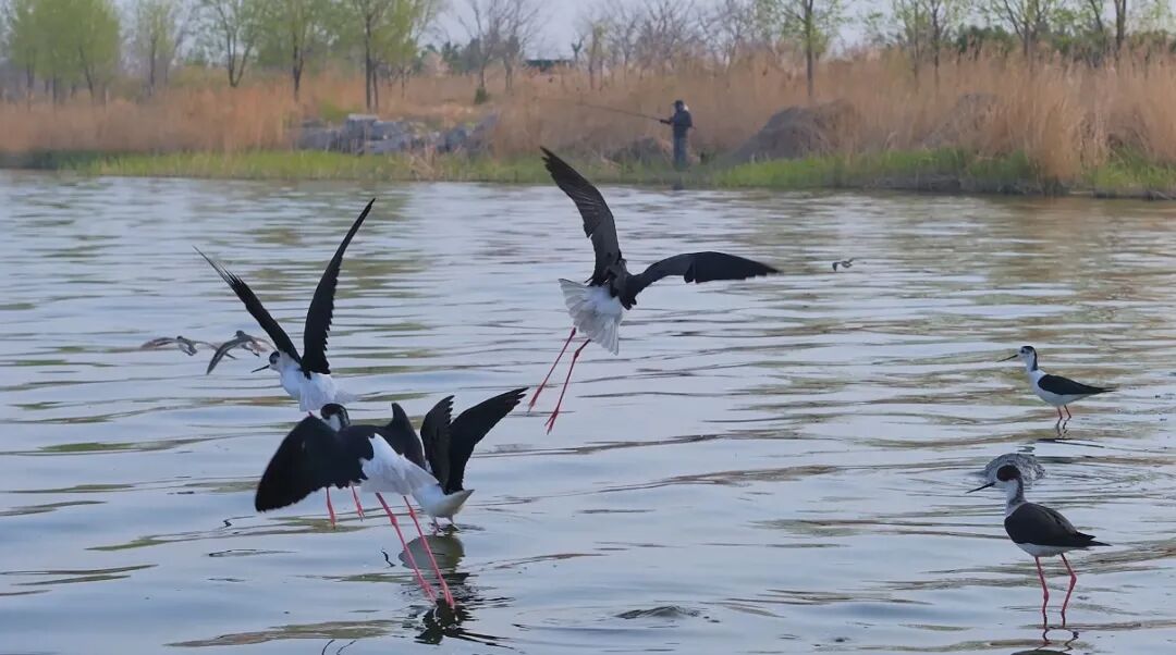 水面上,黑翅长脚鹬等鸟儿自在游弋,灵动的身影为春日增添了无限野趣。