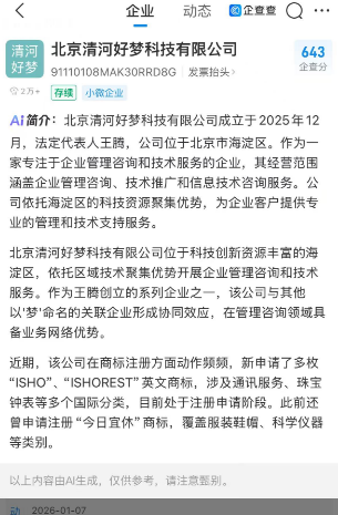 4月23日,企查查APP显示,北京清河好梦科技有限公司申请注册多枚“ISHO”、“ISHO REST”商标,国际分类涉及通讯服务、珠宝钟表等,当前商标状态均为注册申请中。