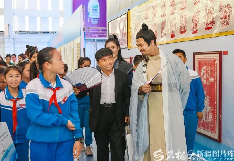 4月23日,在首届喀什全民阅读大会之“诗遇李白”环节中,李白扮演者和群众互动。石榴云/新疆日报 记者约提克尔·尼加提 摄