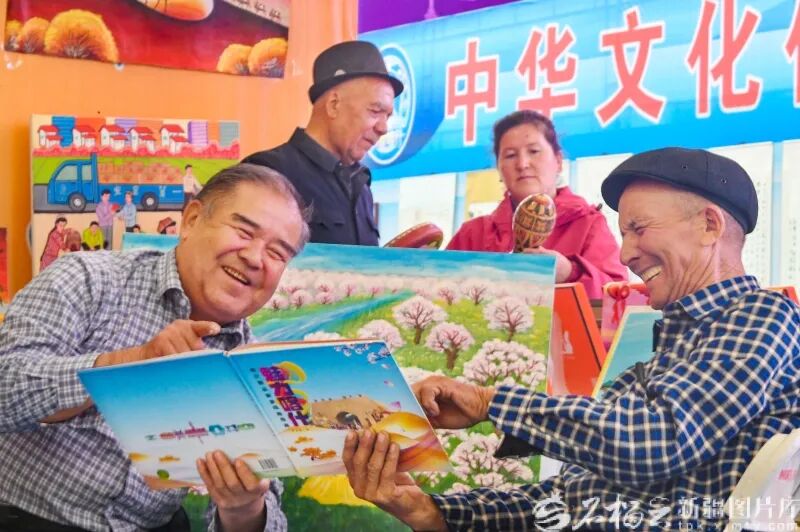 4月23日,在首届喀什全民阅读大会非遗展区,来自麦盖提县的两位农民画家在观看魅力喀什画刊。石榴云/新疆日报 记者约提克尔·尼加提 摄