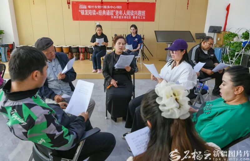 4月23日,居民在喀什市东湖街道东湖社区“银发陪读+经典诵读”老年人阅读兴趣班里进行阅读。石榴云/新疆日报 记者约提克尔·尼加提 摄