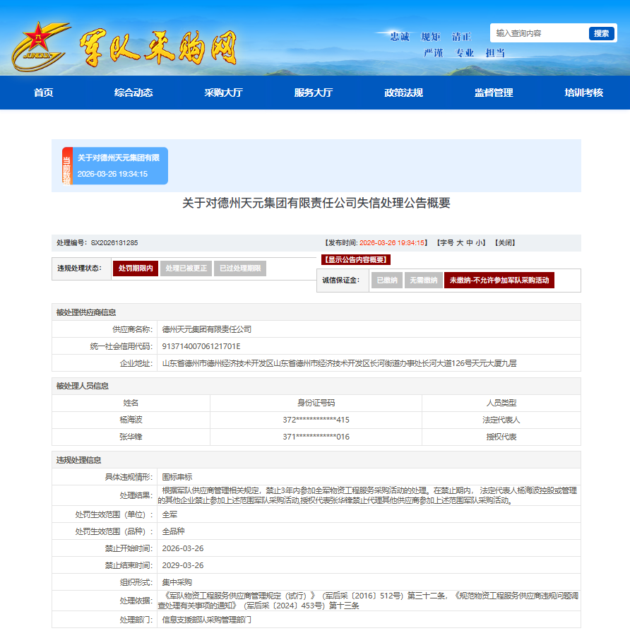 军队采购网日前发布《关于对德州天元集团有限责任公司失信处理公告概要》,公告显示,因存在“围标串标”行为,信息支援部队采购管理部门根据军队供应商管理相关规定,决定三年内禁止德州天元集团有限责任公司参加全军物资工程服务采购活动。在禁止期内,法定代表人杨海波控股或管理的其他企业禁止参加上述范围军队采购活动,授权代表张华锋禁止代理其他供应商参加上述范围军队采购活动。