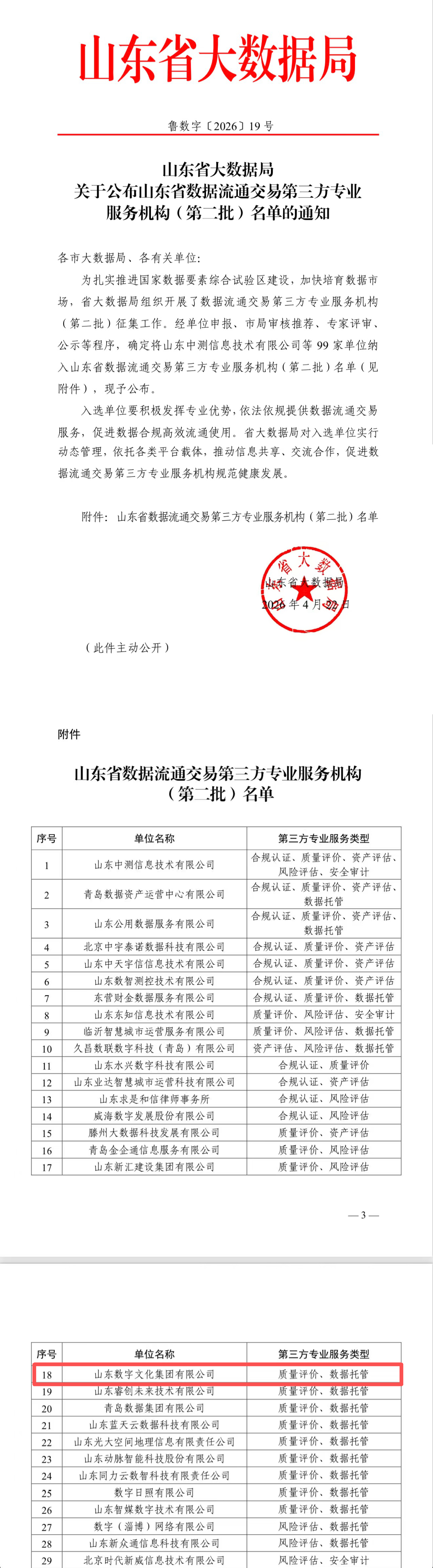 近日,山东省大数据局发布山东省数据流通交易第三方专业服务机构(第二批)名单,山东数字文化集团成功入选。作为入选机构,集团将重点承担质量评估与数据托管等关键服务,为数据要素市场的安全、合规、高效流通提供坚实支撑。