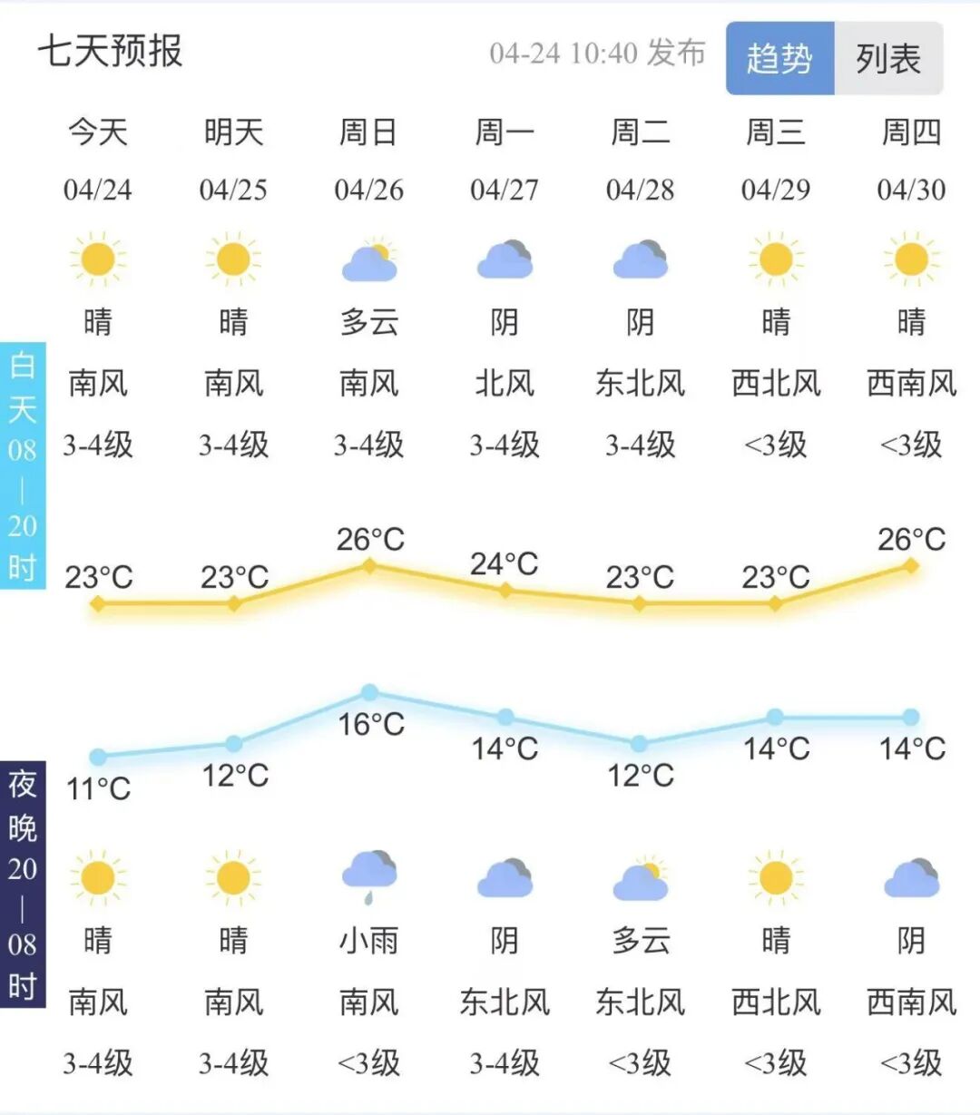 24日下午到25日白天,全省天气晴间多云。南风,鲁西北、鲁中山区和半岛地区4~5级阵风6~7级,其他地区3~4级。最低气温:济南、鲁西北和北部沿海地区13℃左右,其他地区10℃左右。25日最高气温:滨州、东营、淄博、潍坊和半岛内陆地区29℃左右,其他地区24℃左右。