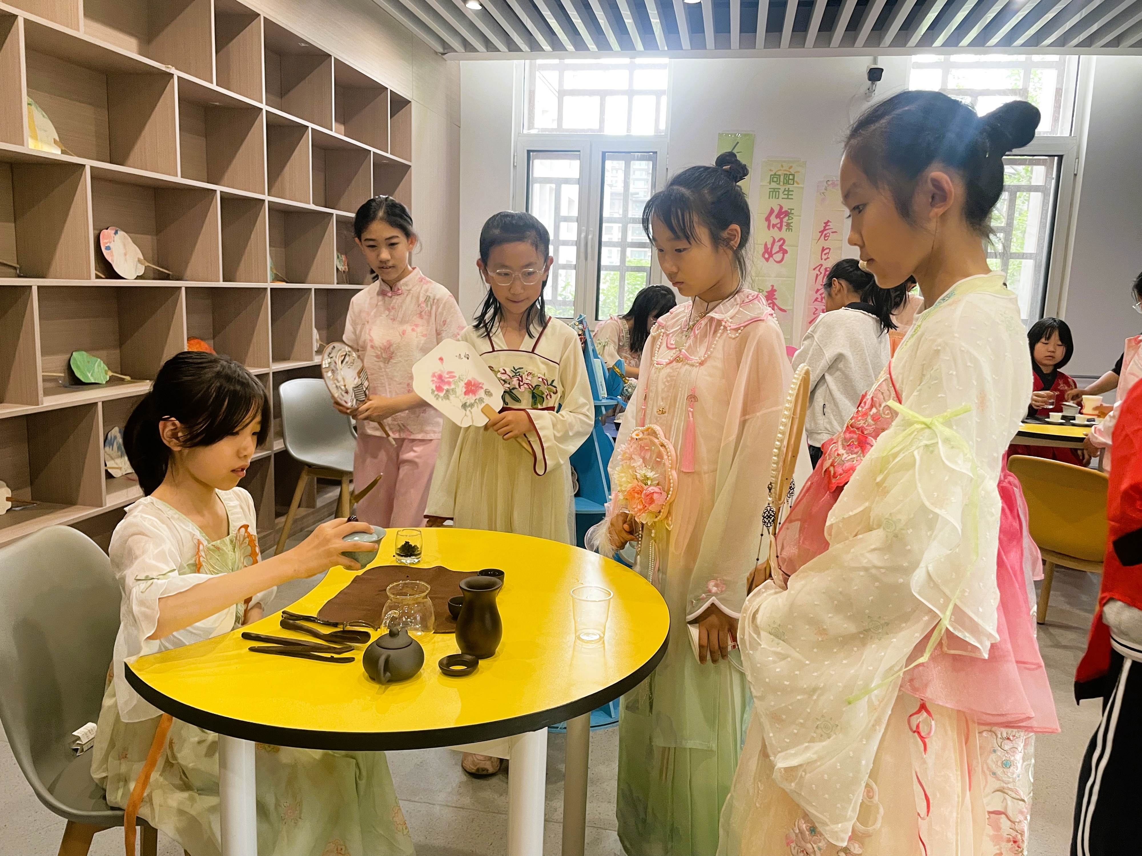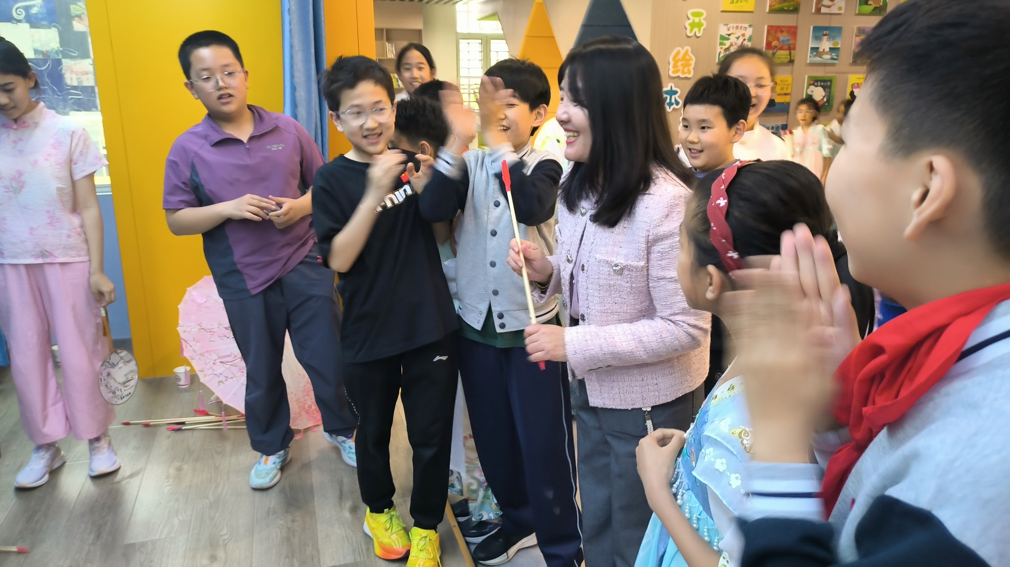 艺术创作环节,队员们以笔为媒,巧绘海棠扇面,用画笔诠释心中的海棠风韵。恰逢世界读书日,学校还举办了别开生面的海棠雅集。飞花令、诗词拼贴、传统投壶、品茗交流……学生们在趣味互动中展示学习成果,沉浸式感受传统文化的独特魅力。