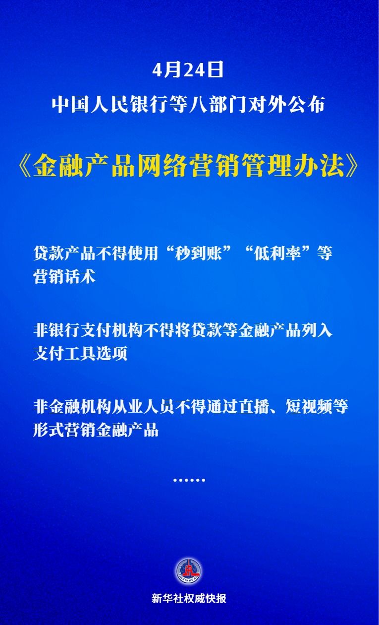 4月24日,中国人民银行等八部门对外公布《金融产品网络营销管理办法》,对金融机构开展金融产品网络营销以及第三方互联网平台接受金融机构委托为金融产品网络营销提供服务的行为进行全面规范,更好保护金融消费者和投资者合法权益。