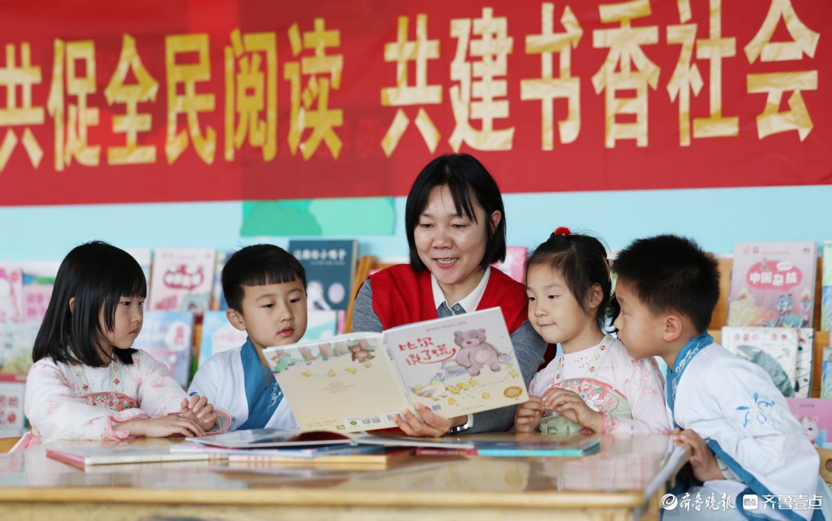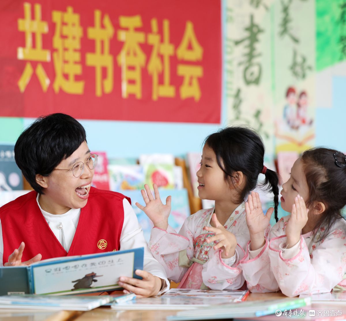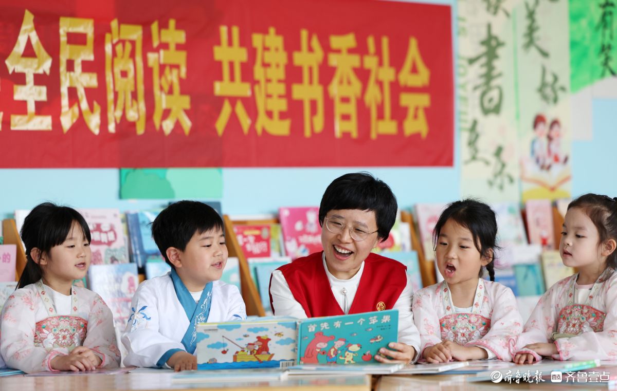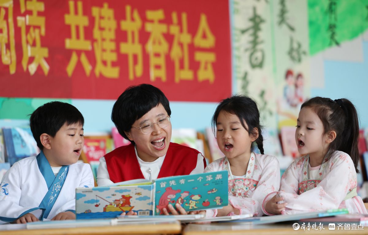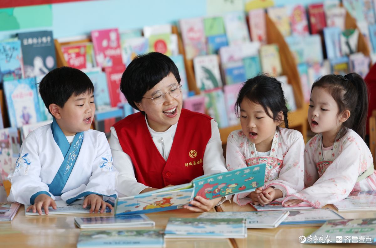 4月23日,临沂市郯城县妇联志愿者为郯城街道中心幼儿园的孩子们讲绘本故事。当日是世界读书日,山东省临沂市郯城县妇联组织志愿者开展“世界读书日快乐伴读”志愿服务活动,志愿者给小朋友们讲绘本故事,带孩子们背诵诗词和童谣,提升幼儿阅读兴趣。张春雷摄