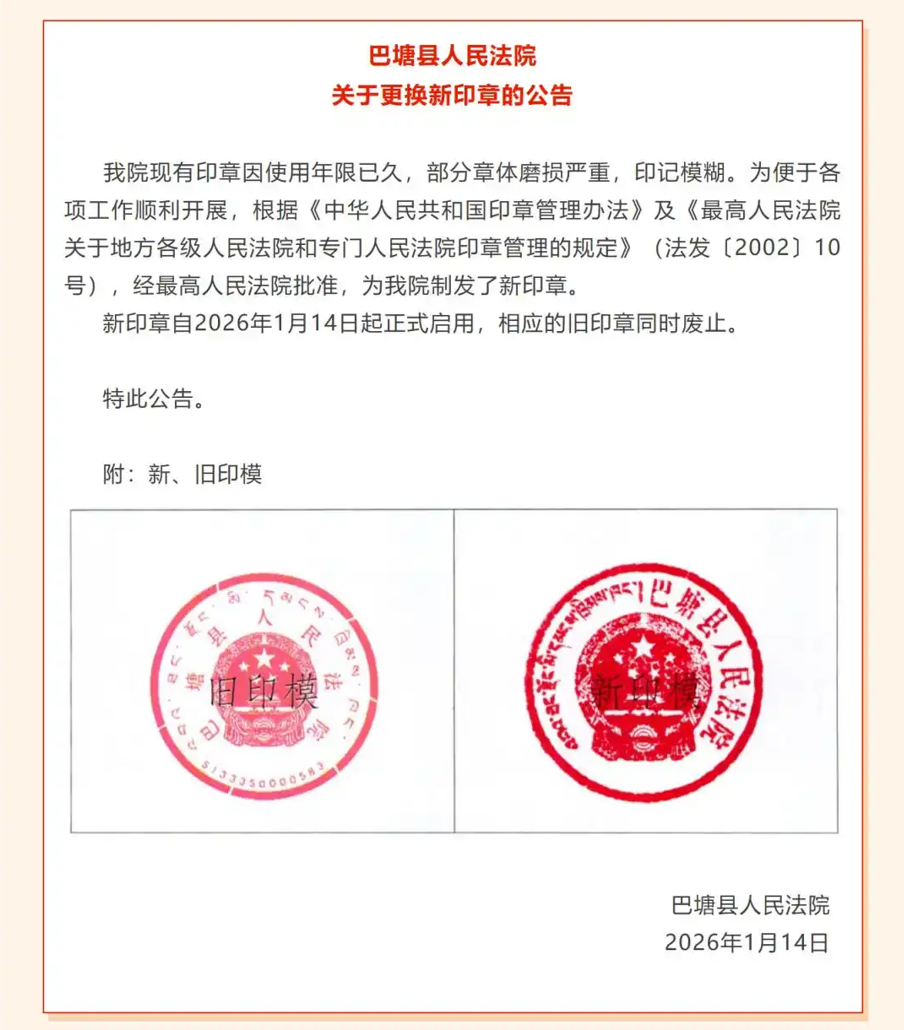 2026年1月14日,四川巴塘县人民法院发布关于更换新印章的公告,这本是常规政务工作,却因一个关键疏漏引发关注——公告援引的《中华人民共和国印章管理办法》,竟是一部从未出台、无任何法律效力的“虚假法规”。直至三个月后上级法院提醒,该错误才被纠正。