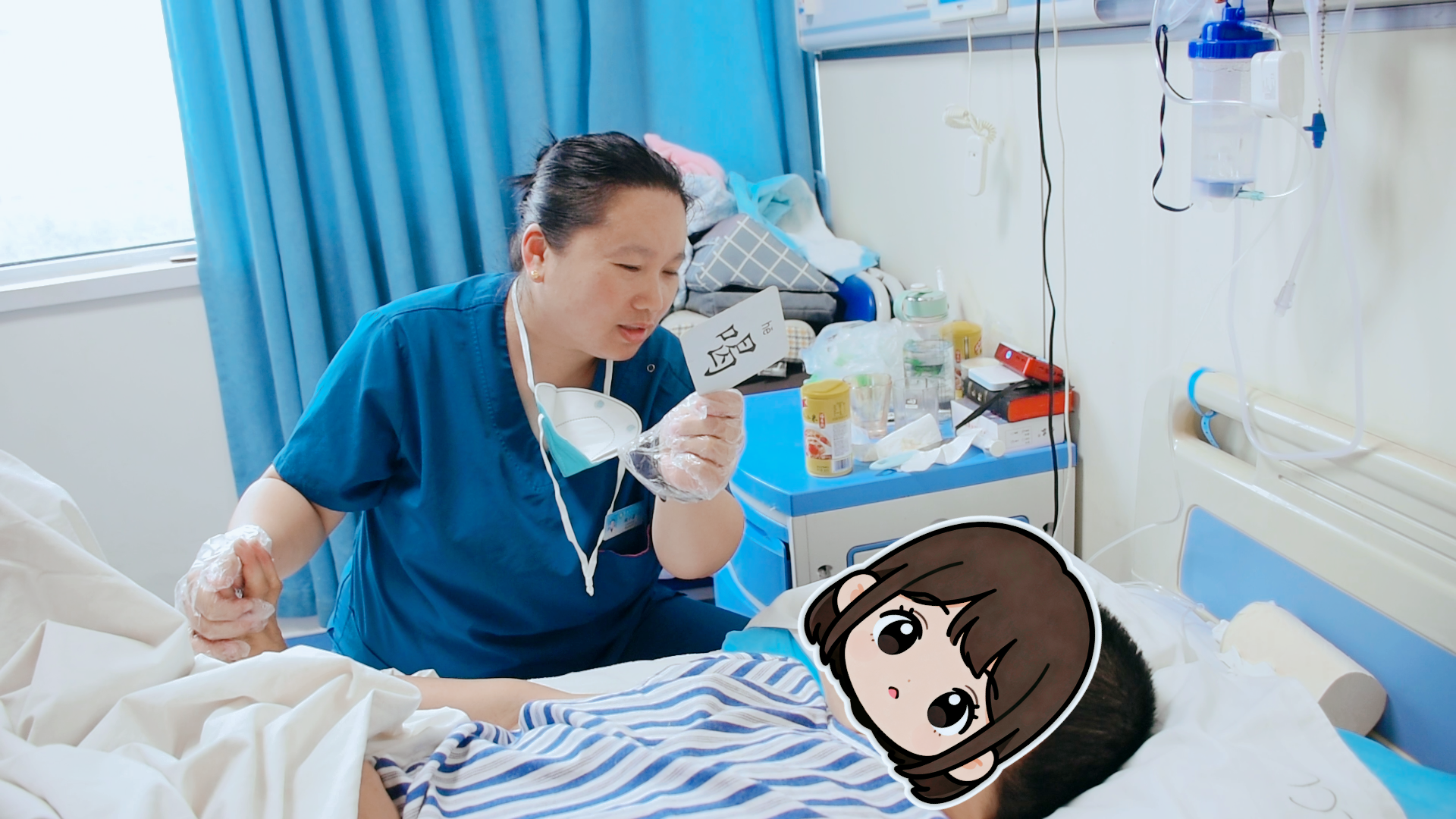奇迹,往往藏在日复一日的坚持里。主管治疗师魏小菲在一次进行的日常言语训练中,发现梁女士的嘴唇微微动了一下。魏小菲立刻放慢语速,俯下身去,轻声引导她。梁女士努力了很久,嘴唇颤抖着,终于,一个字从她口中缓缓溢出——“啊”。