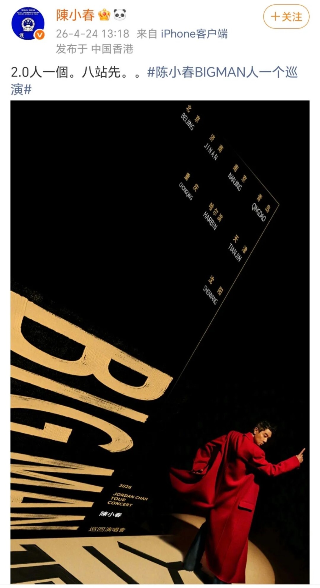 4月24日,陈小春通过个人社交媒体账号正式公布“2.0人一個”巡回演唱会城市安排,青岛成为首批八座城市之一。消息一出,青岛歌迷瞬间沸腾。