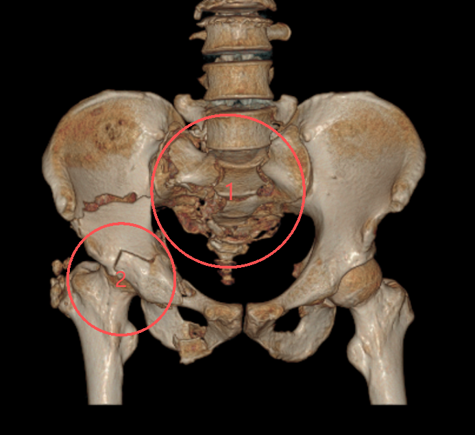严重骨盆骨折,骶骨粉碎H型骨折,右侧髋臼骨折。图中“1”为骨盆后环骶骨严重粉碎性骨折,预示着高能量损伤,往往见于高处坠落伤,会引起致命性大出血和神经损伤;图中“2”为髋臼双柱骨折,治疗难度大,被称为创伤骨科的“皇冠级”手术。时间就是生命!急诊外科团队立即启动严重创伤救治预案,准备实施损伤控制手术——以简单有效的外固定,快速控制出血、稳定骨盆环和肢体力线,稳定血液动力学,逆转“死亡三联征”,为抢救生命创造机会。
