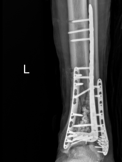3月20日,急诊外科团队实施了左胫腓骨远端骨折切开复位内固定术,成功复位骨折、稳固固定,恢复左下肢正常力线。