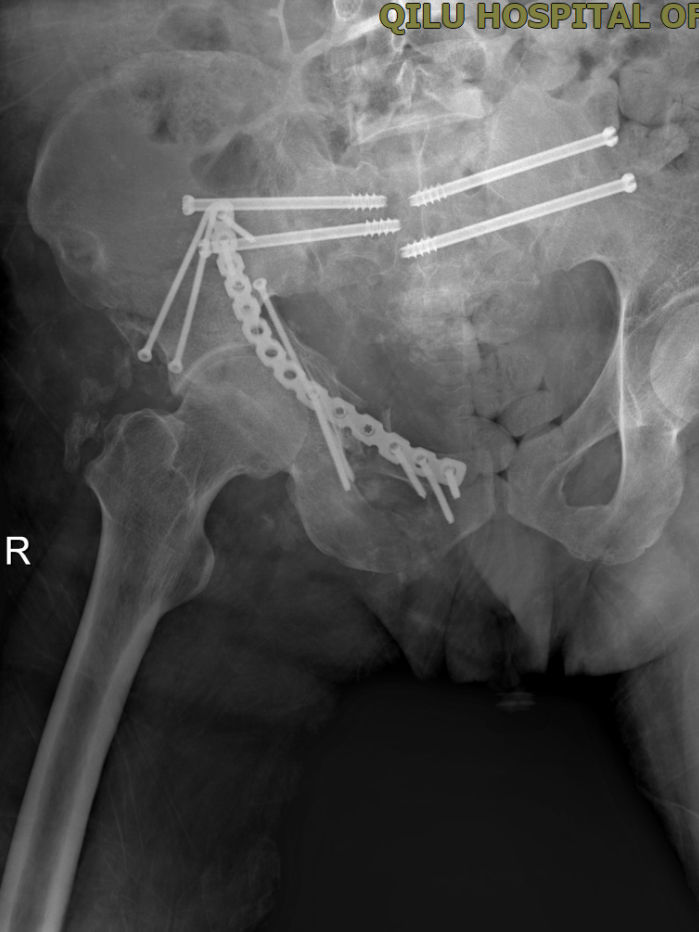 3月24日,团队再次实施右髋臼陈旧性骨折切开复位内固定术+股神经探查松解术+抗生素人工骨植入术,实现骨折修复、神经松解、感染预防三大目标。