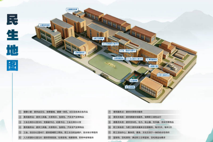 在该矿民生地图上,新增2个惠民服务站、1个健康小屋,搭配原有6个便民充电桩、8个新能源充电桩及2个便民服务点,同步清晰标注人资、信访等办公区域,让职工一目了然知晓休闲、运动、充电、办事的具体位置,解锁隐藏福利与便利。