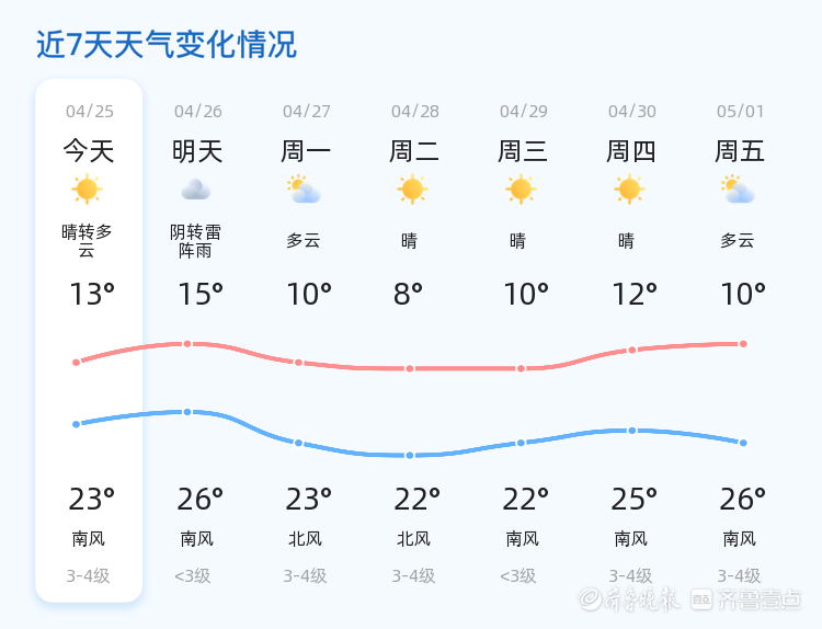 今天是4月25日,星期六,农历三月初九。泰安市今日天气晴转多云,气温介于13℃至23℃之间,西风2级,空气湿度67%,PM2.5指数为42。各区天气情况总体平稳,适合市民户外活动。