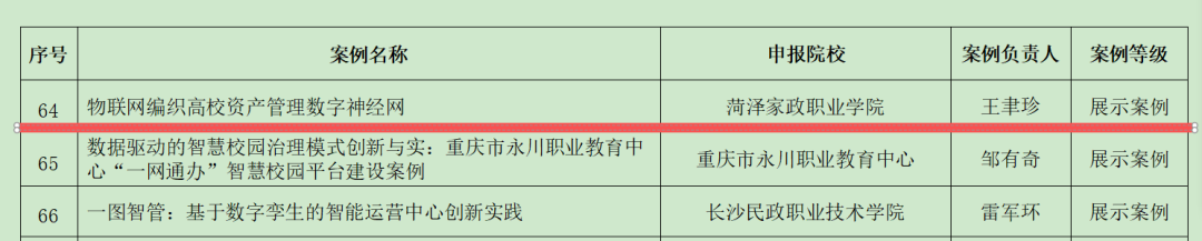 经专家严格评审,本次案例征集最终确定标杆、优秀、展示案例共100项。菏泽家政职业学院喜获两项国家级荣誉,肖晴老师牵头完成的《数智赋能精准服务:打造一站式就业创业育人新生态》获评全国优秀案例,王聿珍老师负责的《物联网编织高校资产管理数字神经网》获评全国展示案例。