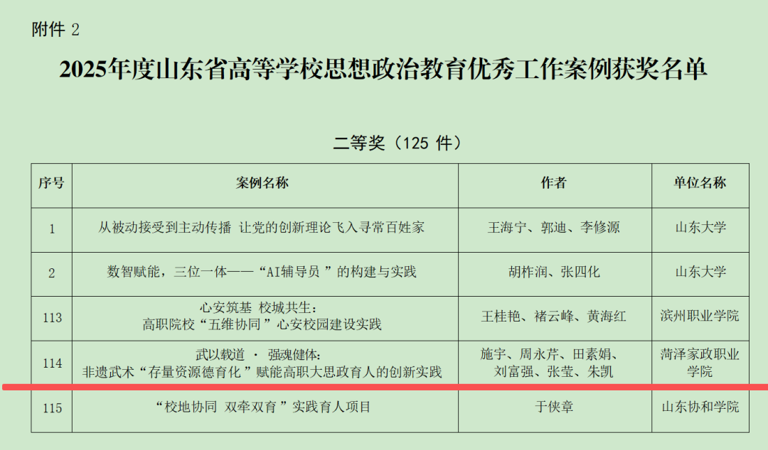本次评选活动由山东省高等学校思想政治教育研究会组织,面向全省高校征集优秀论文与工作案例。根据《关于征集2025年度山东省高等学校思想政治教育优秀论文和工作案例的通知》要求,经省内外专家严格评审,最终评选出优秀论文一等奖41篇、二等奖56篇、三等奖78篇;优秀工作案例一等奖98件、二等奖125件、三等奖197件。菏泽家政职业学院施宇、周永芹等老师报送的案例《武以载道·强魂健体:非遗武术“存量资源德育化”赋能高职大思政育人的创新实践》,成功斩获二等奖。
