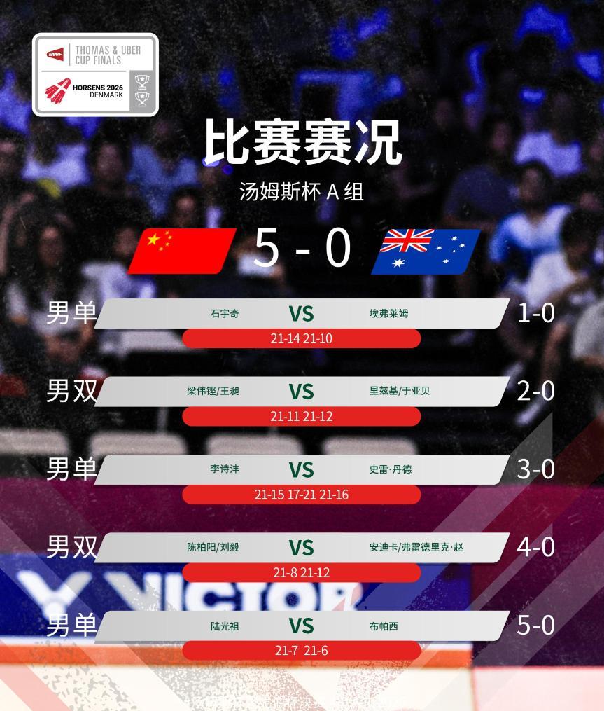 2026年汤姆斯杯暨尤伯杯决赛圈比赛24日在此间揭幕,在小组赛首轮较量中,卫冕冠军中国男队、女队均以5:0战胜对手,收获“开门红”。
