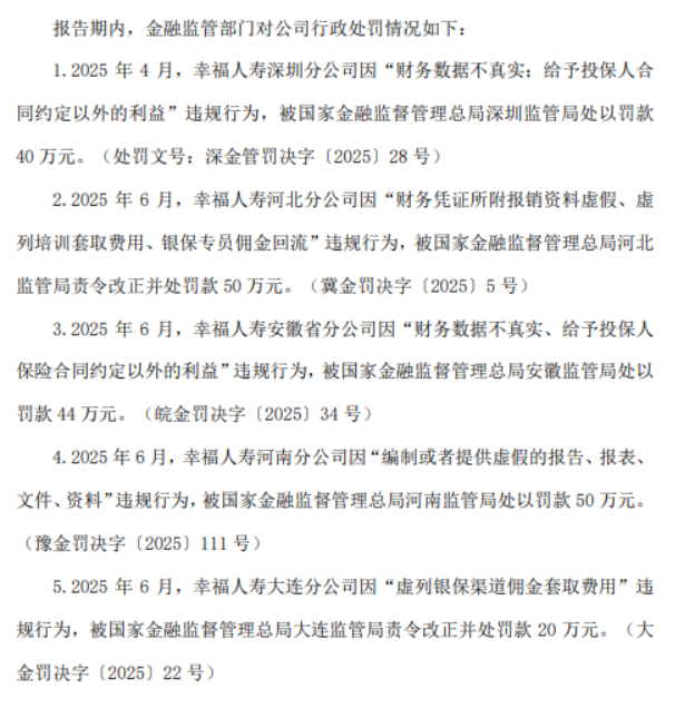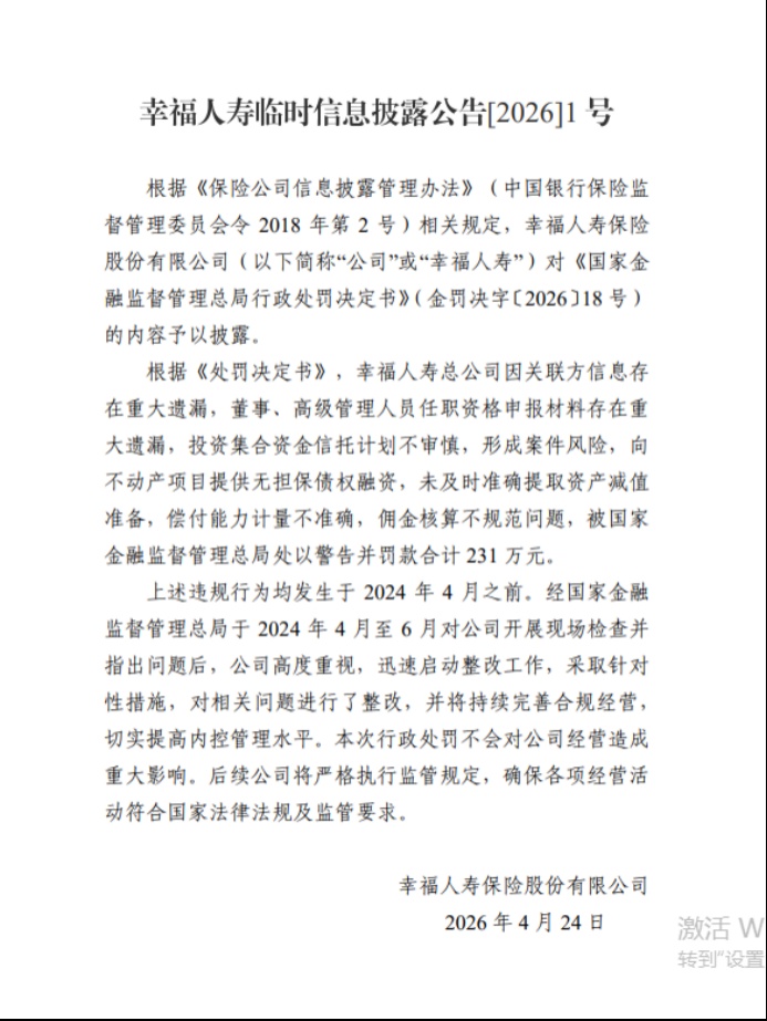 同日,幸福人寿在官网发布临时公告回应称,幸福人寿总公司因关联方信息存在重大遗漏,董事、高级管理人员任职资格申报材料存在重大遗漏,投资集合资金信托计划不审慎,形成案件风险,向不动产项目提供无担保债权融资,未及时准确提取资产减值准备,偿付能力计量不准确,佣金核算不规范问题,被国家金融监督管理总局处以警告并罚款合计231万元。上述违规行为均发生于2024年4月之前。经国家金融监督管理总局于2024年4月至6月对公司开展现场检查并指出问题后,公司高度重视,迅速启动整改工作,采取针对性措施,对相关问题进行了整改,并将持续完善合规经营,切实提高内控管理水平。本次行政处罚不会对公司经营造成重大影响。后续公司将严格执行监管规定,确保各项经营活动符合国家法律法规及监管要求。