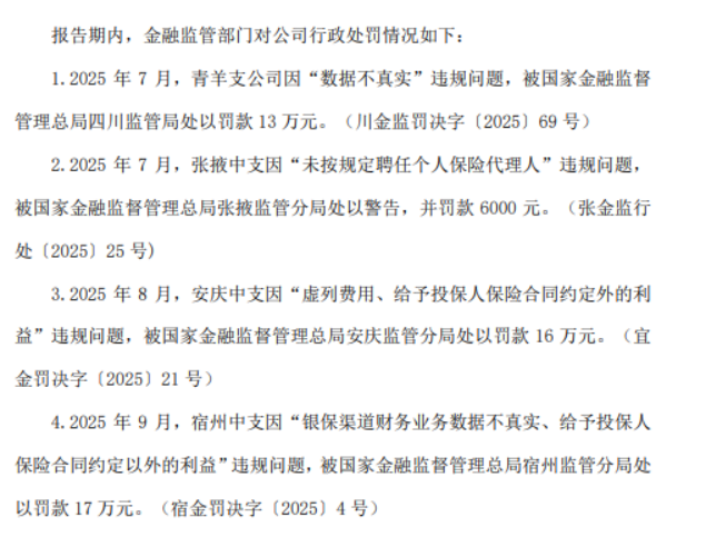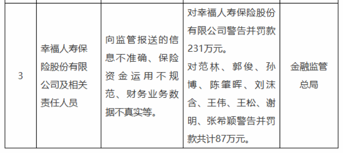 其中,幸福人寿保险股份有限公司因向监管报送的信息不准确、保险资金运用不规范、财务业务数据不真实等被警告并罚款231万元。同时,范林、郭俊、孙博、陈肇晖、刘沫含、王伟、王松、谢明、张希颖被警告并罚款共计87万元。