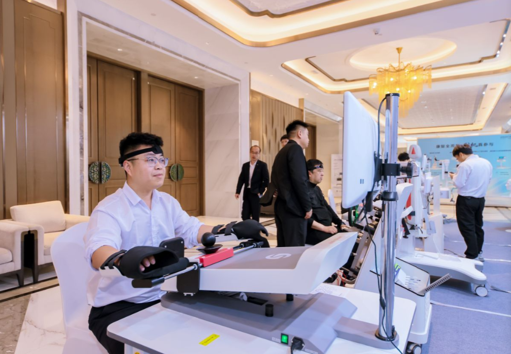 图为在同期举办的全国智能康复产业博览会上,参会者在参观体验智能康复设备。