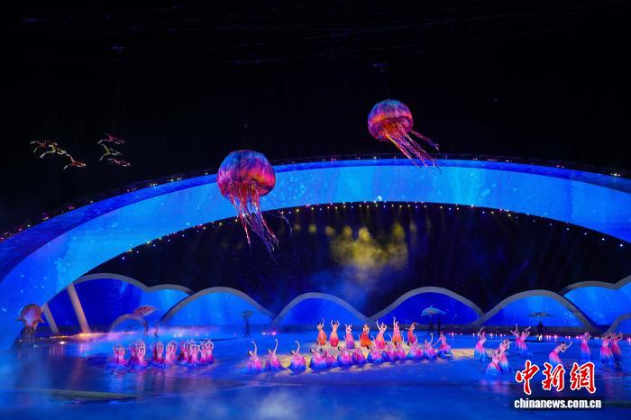 4月22日晚,第六届亚洲沙滩运动会开幕式在三亚亚沙公园举行。图为开幕式上的海洋元素文艺表演,充气水母“游”进演出现场。(第六届亚洲沙滩运动会组委会 供图)