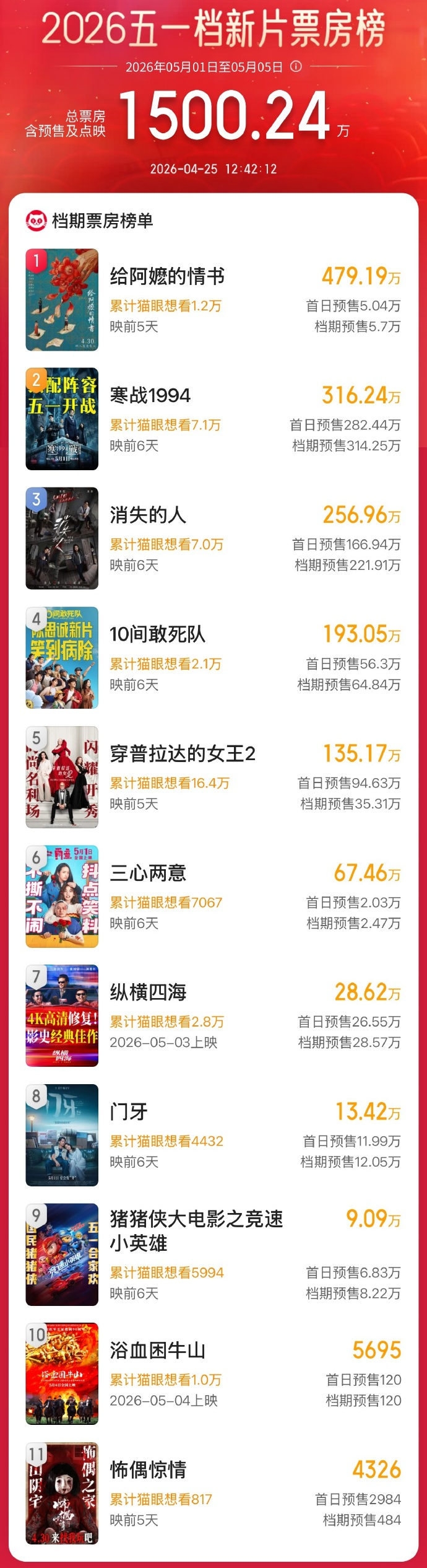 据网络平台数据,2026年五一档新片预售票房突破1500万,《给阿嬷的情书》《寒战1994》《消失的人》分列前三位。(央视新闻)