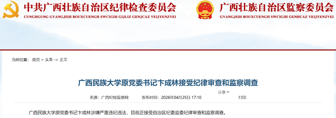 广西民族大学原党委书记卞成林涉嫌严重违纪违法,目前正接受自治区纪委监委纪律审查和监察调查。
