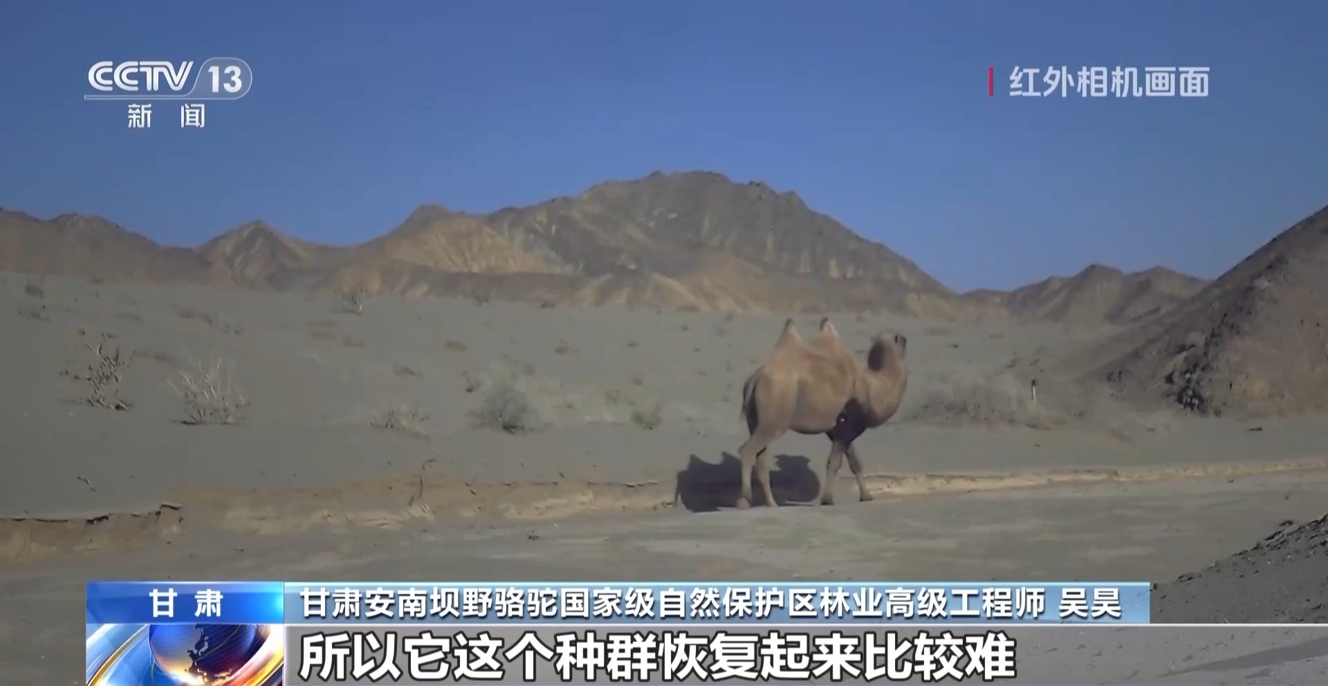 甘肃安南坝野骆驼国家级自然保护区林业高级工程师 吴昊:野骆驼的听觉跟嗅觉是非常灵敏的,在几公里以外,只要有汽笛声,它就赶紧逃离躲避了。我们平时都是通过远程视频监控或者用红外相机进行拍摄。