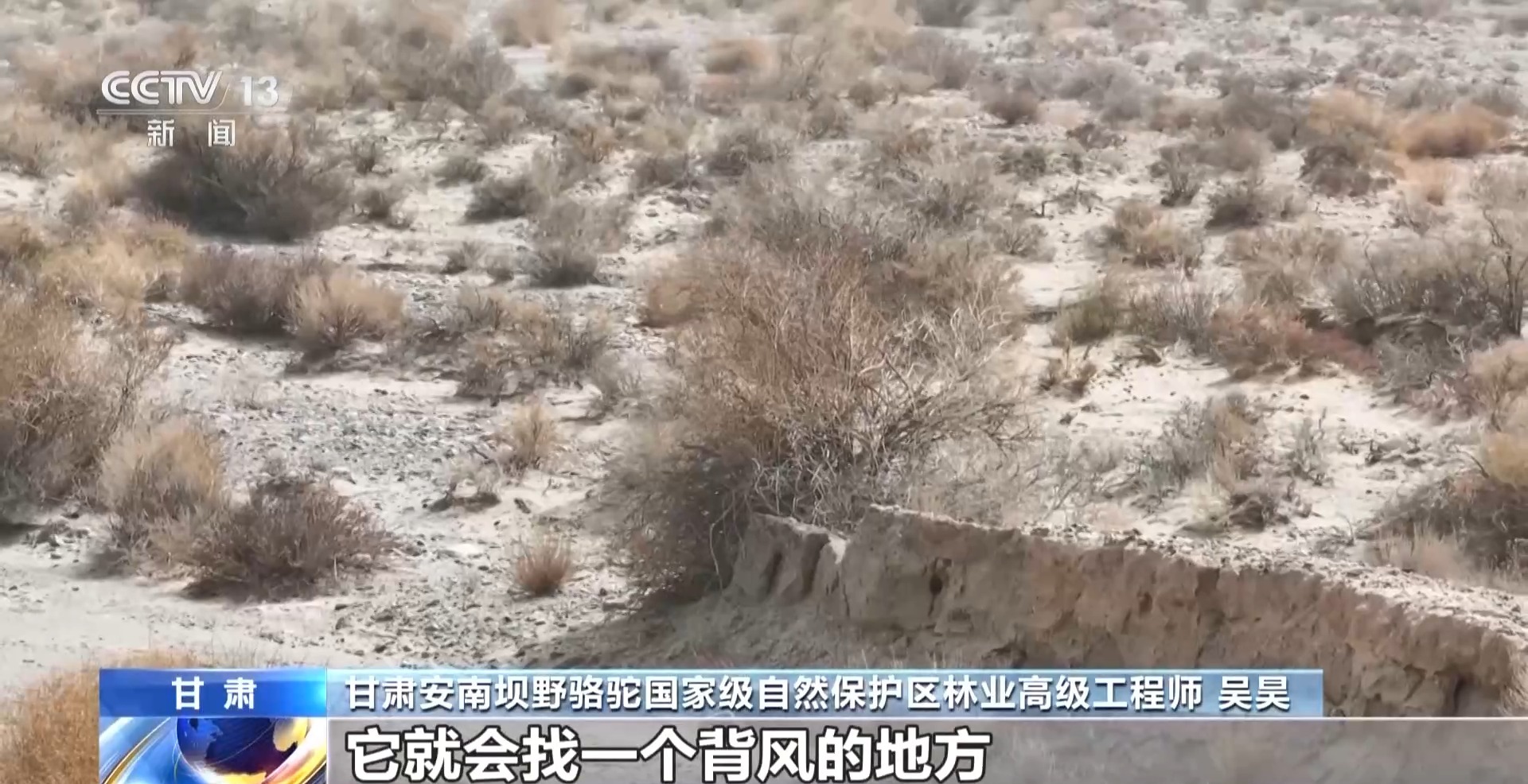 甘肃安南坝野骆驼国家级自然保护区林业高级工程师 吴昊:遇到强沙尘天气的时候,它就会找一个背风的地方,选择趴下,头低下,顺风躲避。