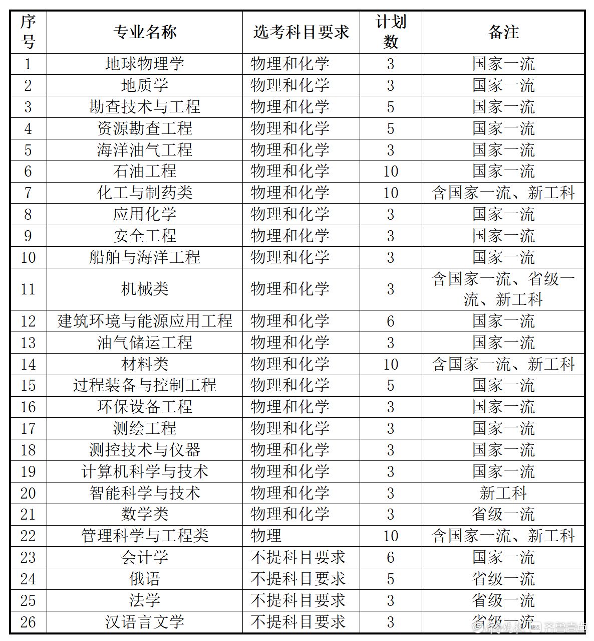 值得注意的是,石大今年的综招简章在专业备注中明确标注了“国家一流”、“省级一流”、“新工科”等建设情况,为考生选择提供了更清晰的参考。