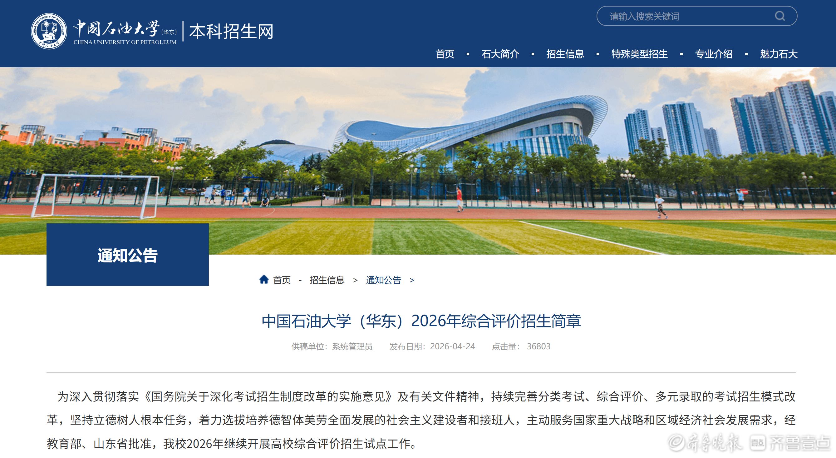 4月24日,中国石油大学(华东)正式发布2026年综合评价招生简章。记者对比发现,与2025年相比,中国石油大学(华东)2026年综招在报名条件、专业设置等方面均有调整,其中最大的变化是全面取消学科竞赛获奖的报考“硬门槛”,转而更加强调学生的学业成绩和综合素质过程性评价。这一变化呼应了教育部及山东省“淡化学科竞赛导向,强化过程评价”的招生改革方向。