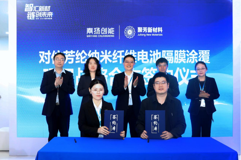2026年4月21日,在CHINAPLAS 2026 国际橡塑展京博展台现场,山东聚芳新材料股份有限公司与秦扬创能(扬州)新材料有限公司成功举行对位芳纶纳米纤维电池隔膜涂覆项目战略合作签约仪式。双方围绕高性能芳纶材料与锂电池安全隔膜应用展开深度合作,以材料创新赋能新能源产业安全升级。