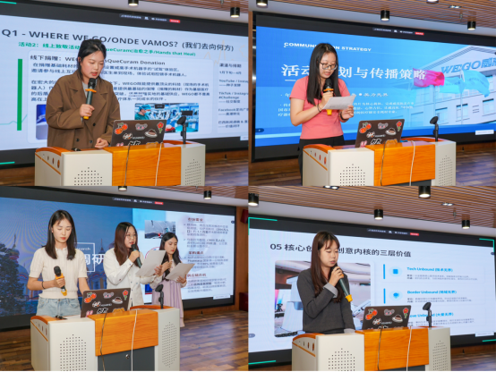 工作坊的重头戏是学生团队的限时路演。10支队伍依次登台,每组8分钟,围绕威高品牌国际传播的核心议题,呈现了从市场洞察、叙事策略到传播落地的完整方案。
