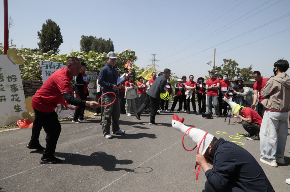 山楂花海间,夹板接力跑、三人绑腿跑、趣味套大鹅、搬砖过河等7项团队趣味项目接连上演,全程弱化专业竞技比拼,所有赛事项目主打全员协作互动,老少皆宜、趣味性十足。