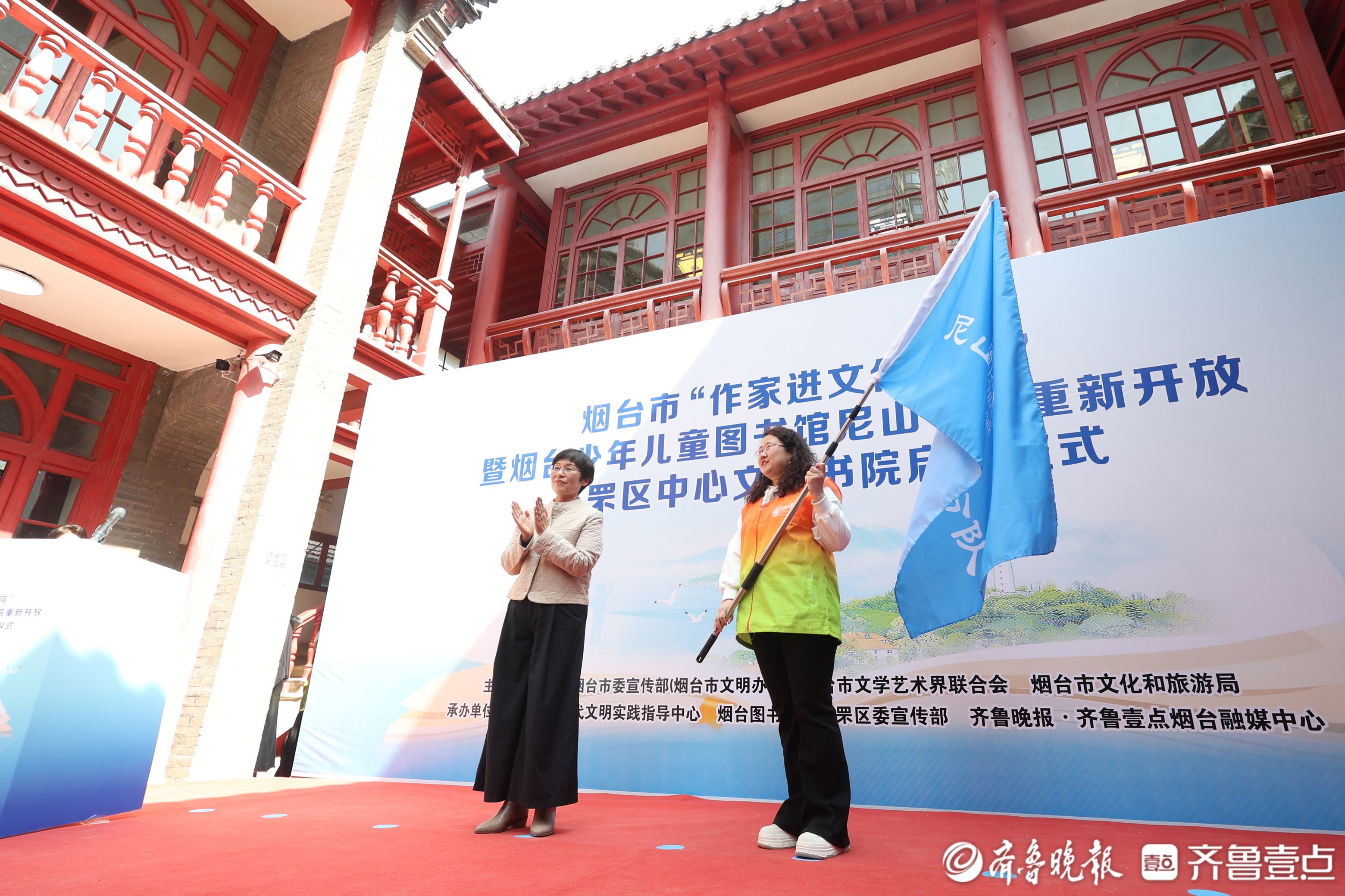 烟台图书馆馆长宋书兰为“芝小游”尼山书院分队授志愿者队旗。