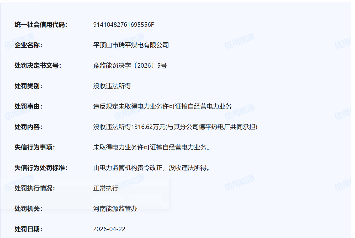 4月22日,河南能源监管办发布行政处罚信息显示,平顶山市瑞平煤电有限公司因违反规定未取得电力业务许可证擅自经营电力业务,被依法没收违法所得1316.62万元,该处罚由瑞平煤电与其分公司德平热电厂共同承担。处罚决定书文号为豫监能罚决字〔2026〕5号,目前处罚已进入正常执行阶段。