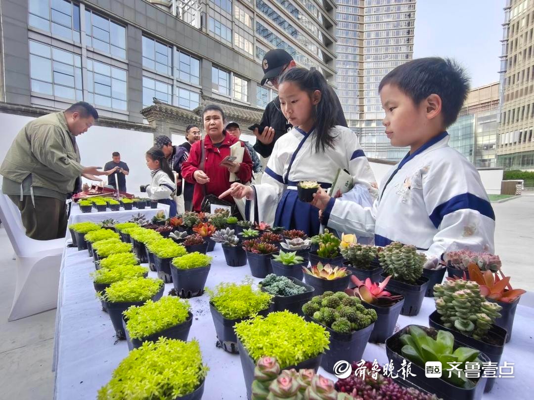 除此之外,全民阅读公益体验区更是人气高涨。最火爆的当属“以书易绿 阅见生机”旧书换绿植公益行动展位。200余盆胖嘟嘟的多肉植物摆满展台,孩子们排着队用旧书换绿植。志愿者郭正宇忙得满头大汗:“孩子们太热情了,1本旧书换1盆多肉,这些回收的书籍将统一捐赠到芝罘区社区文化书院,让书香继续漂流。”