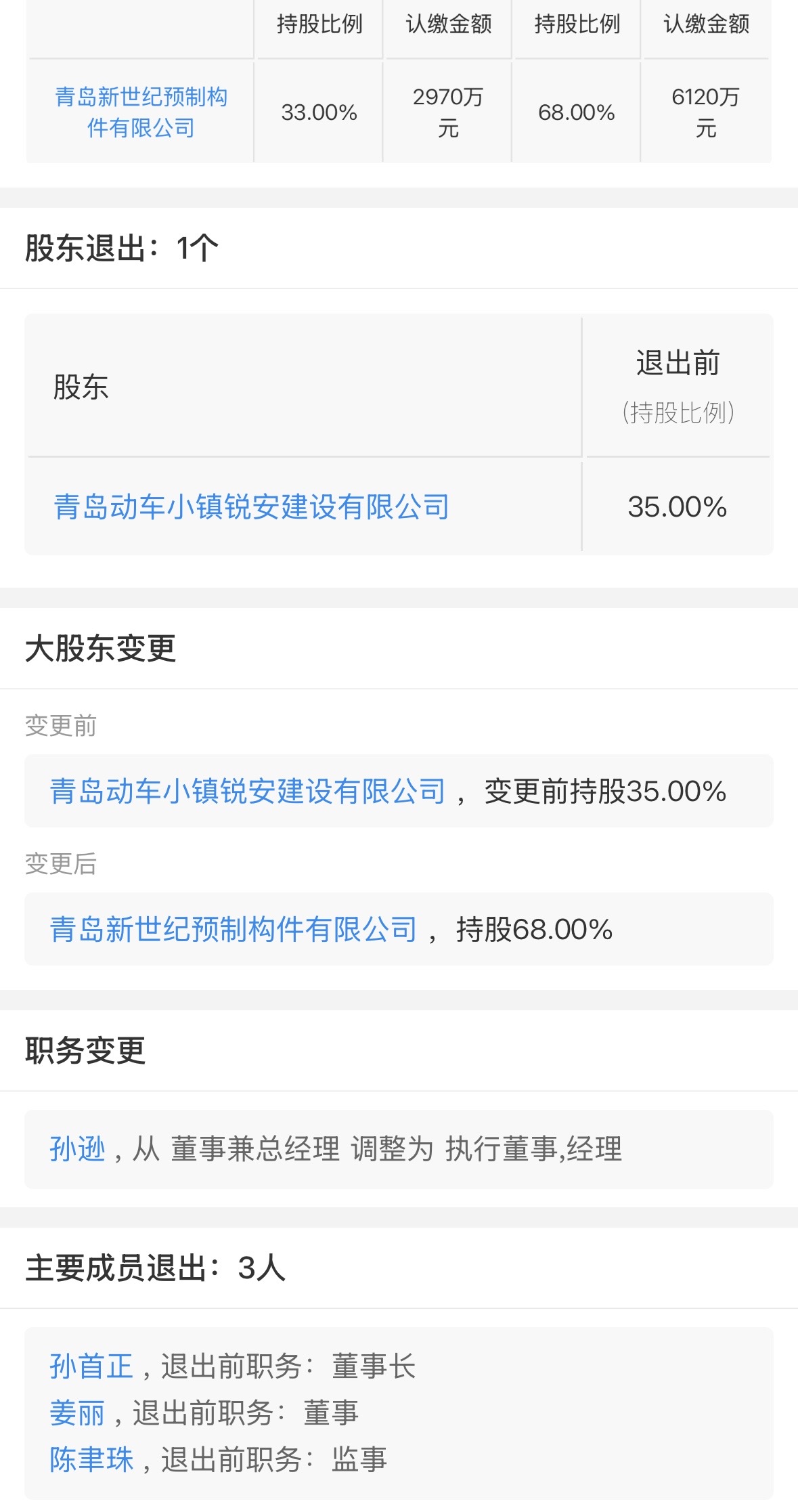 企查查信息显示,4月25日,青岛动车小镇昌明装配建筑科技有限公司(下称“昌明装配”)进行了股东及主要成员变更。青岛城阳国资大股东——青岛动车小镇锐安建设有限公司退出,退出前持股比例为35%;民企方股东之一——青岛新世纪预制构件有限公司持股比例由33%增加到68%。