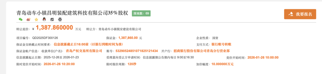 昌明装配成立于2018年1月,注册资本9000万元,孙逊为法定代表人。经济导报记者注意到,2025年12月底,青岛动车小镇锐安建设有限公司所持有的昌明装配35%股权在青岛产权交易所挂牌,挂牌底价为1387.86万元。
