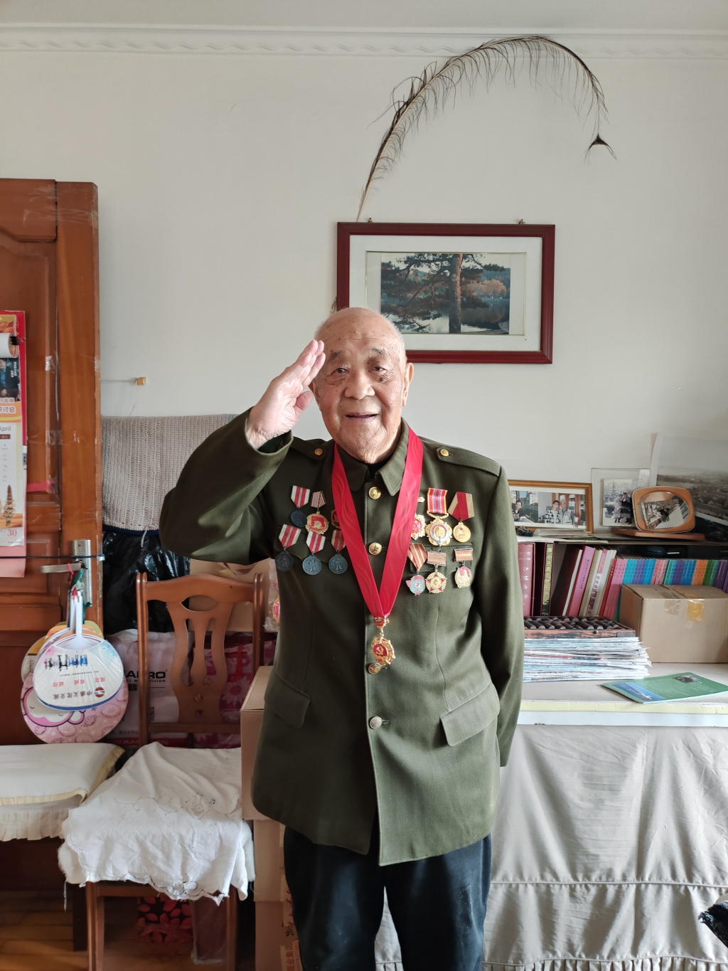 记者来到专家公寓楼下,保安大叔问找谁,一听说是找孟庆林,他竖起大拇指,“会拍照的老革命。”“会拍照”“老革命”,带着这两个关键词,记者走进孟庆林的家。发现门虚掩着,他早早地坐在客厅里等候了。对着门口处,记者一眼就看到了那身挂满奖章的军装。