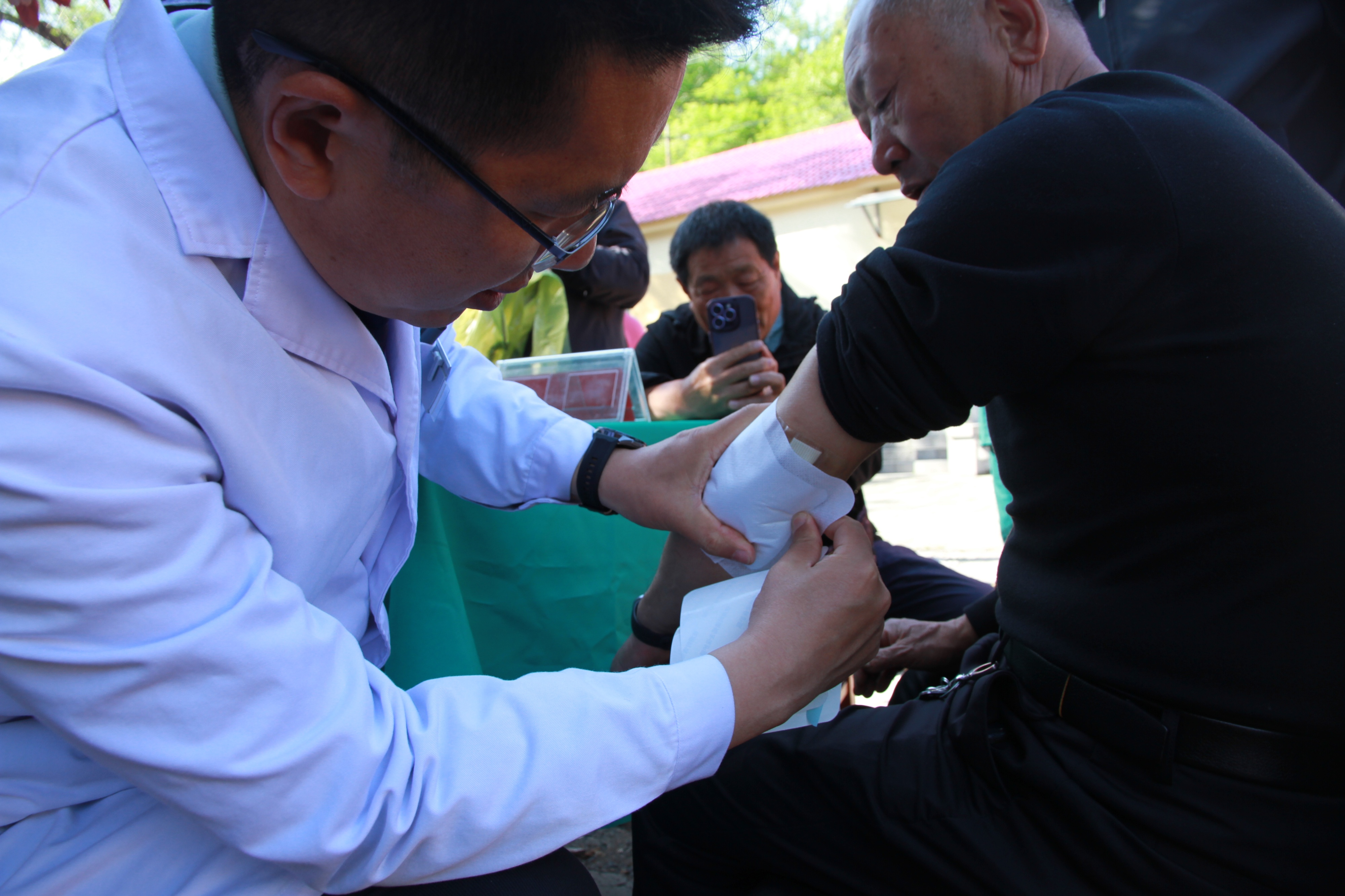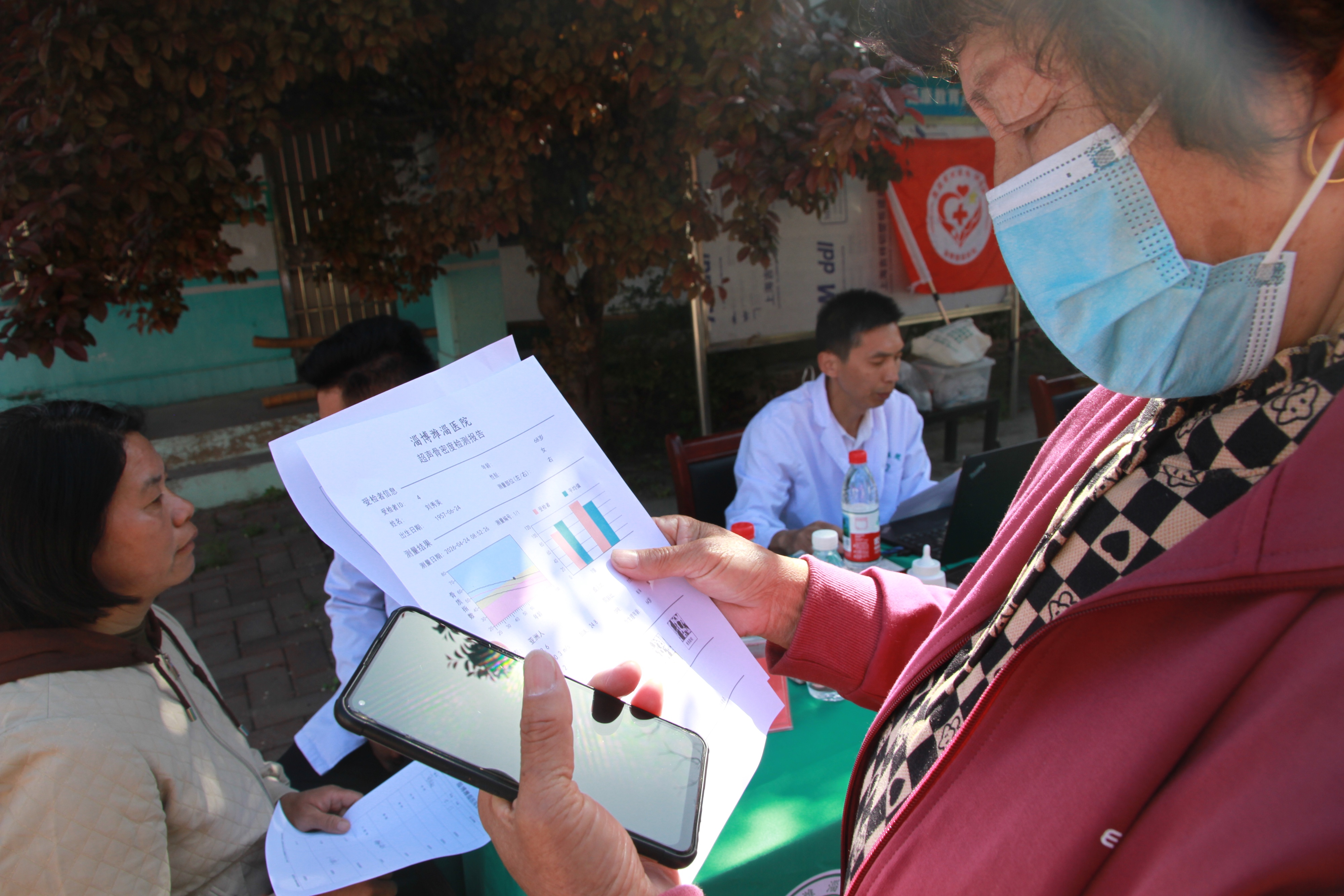 值得一提的是,此次义诊与以往不同,新增了一台便携骨密度测试仪。医护人员小心翼翼地将设备调试好,眼神中透露出专注和认真,还不时地交流着设备的操作细节。