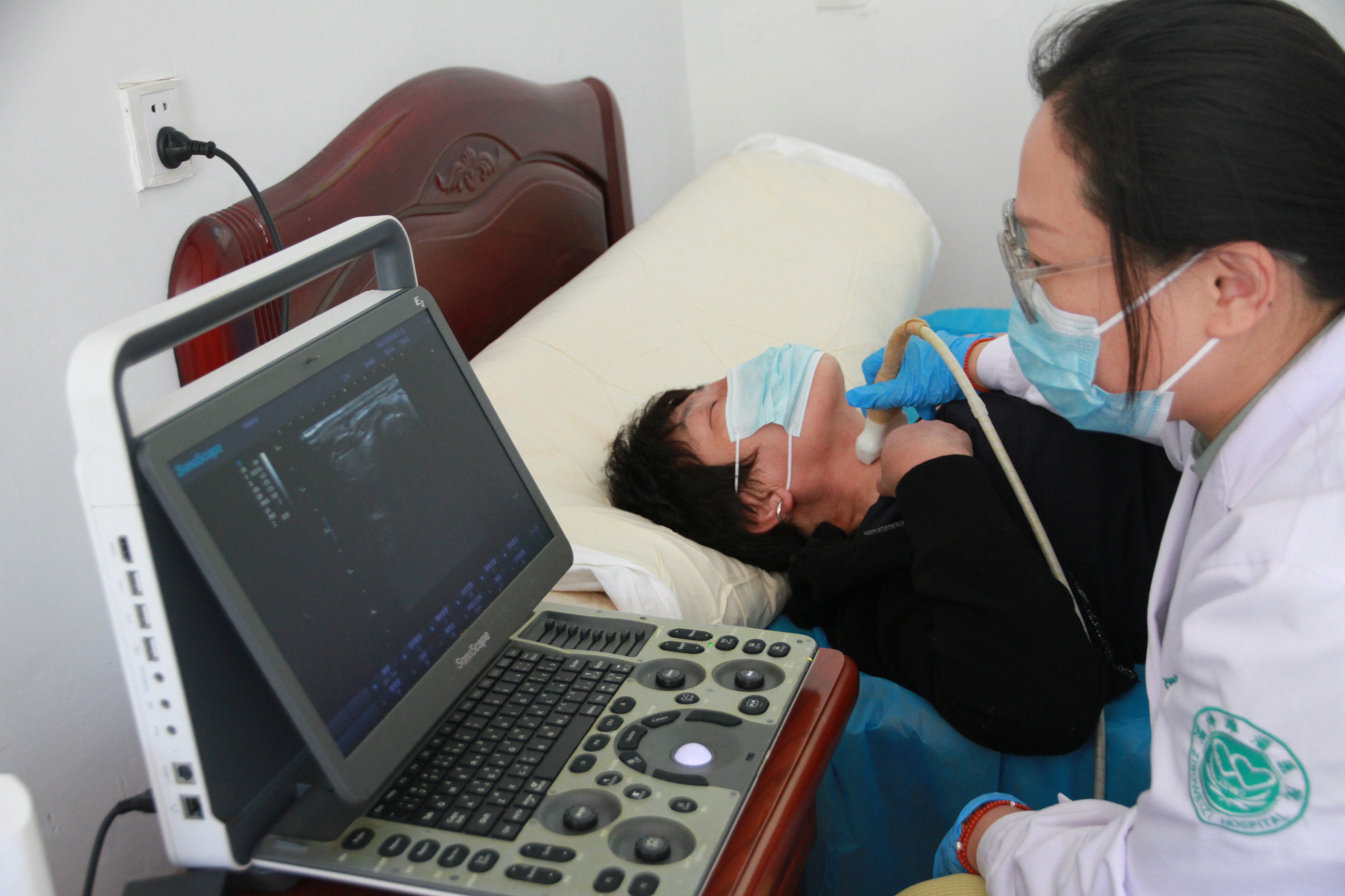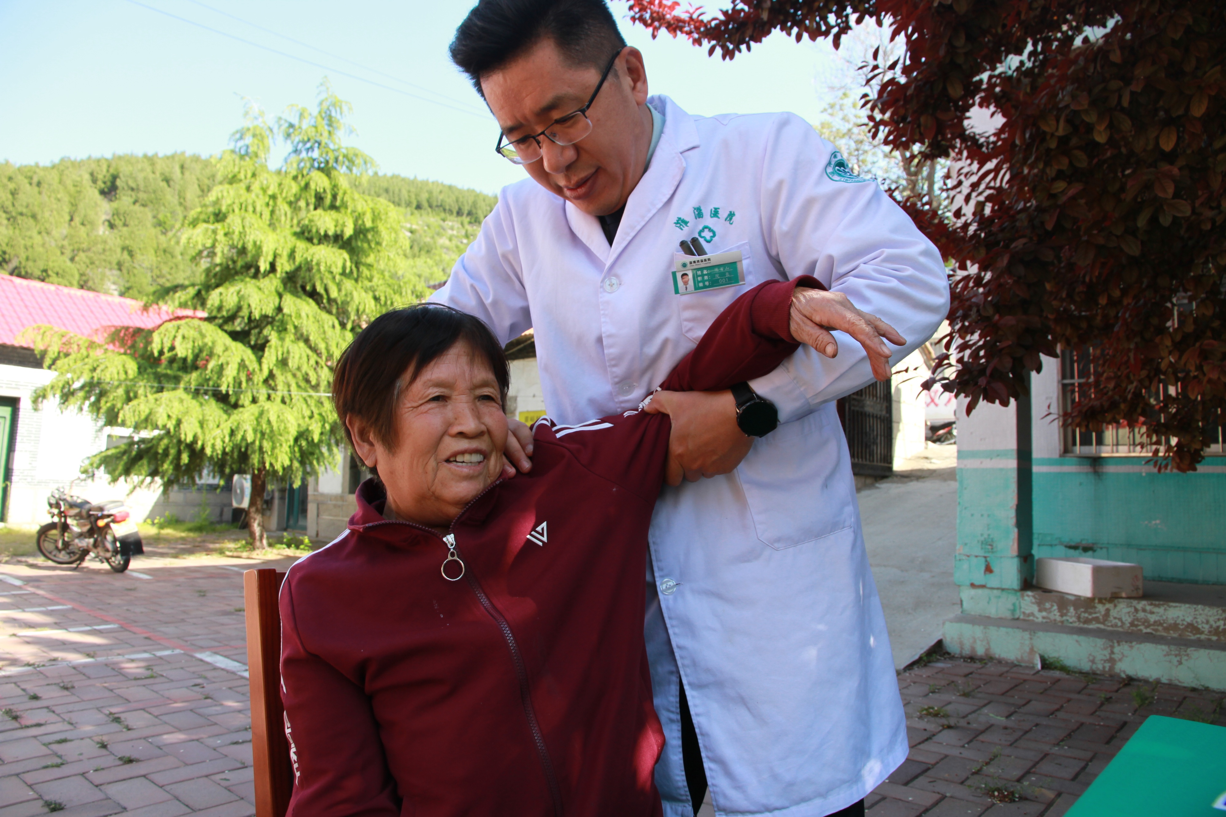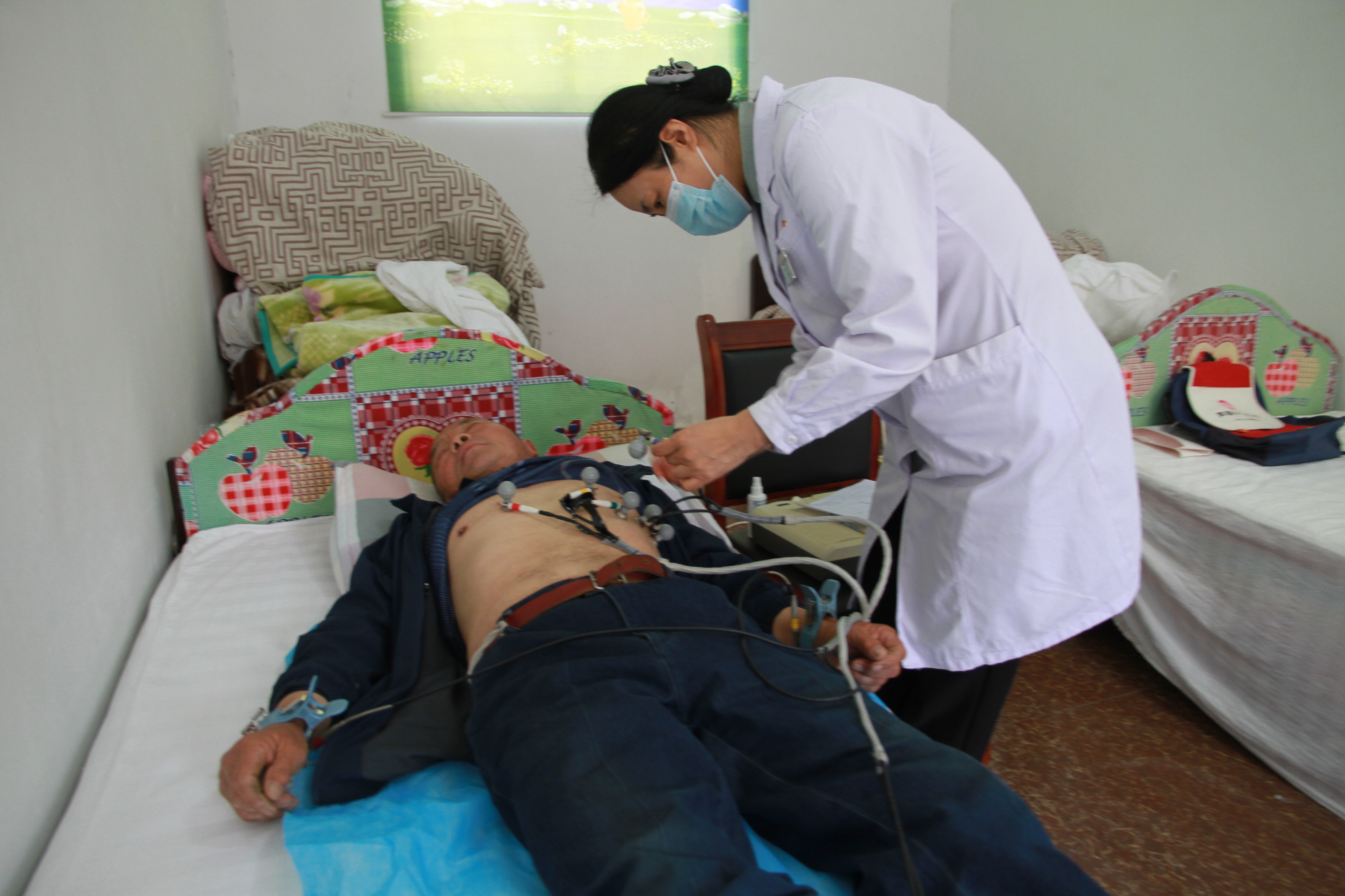 随后,医护人员们迅速行动起来。他们有的从救护车上小心翼翼地搬出心电图仪器、便携式彩超机等诊疗设备,仿佛在搬运着珍贵的宝贝,每一个动作都充满了谨慎;有的和村委工作人员一起,将桌椅板凳从屋里搬到广场上,摆放得整整齐齐。春风中,他们的身影忙碌而有序,不一会儿,一个简易却有序的诊疗场景迅速搭建完成。旁边的民宿也派上了用场,成为做心电图和彩超的理想场所。
