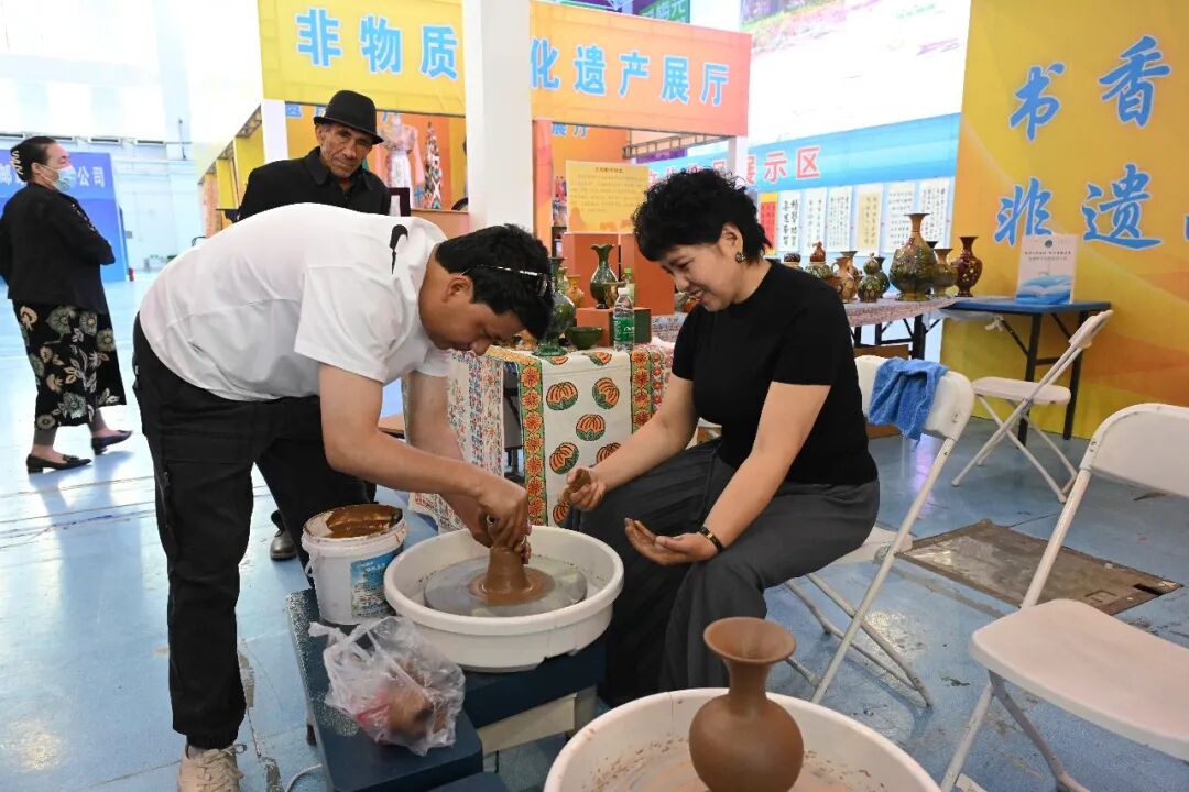 步入非遗展区,映入眼帘的是一方古朴的土陶工作台。展台前,传承人阿卜杜克热木·阿卜杜热合曼正指导参观者哈里丹陈揉捏、拉坯、塑形,不一会儿,一个线条流畅的陶碗初具雏形,引得围观的群众跃跃欲试。