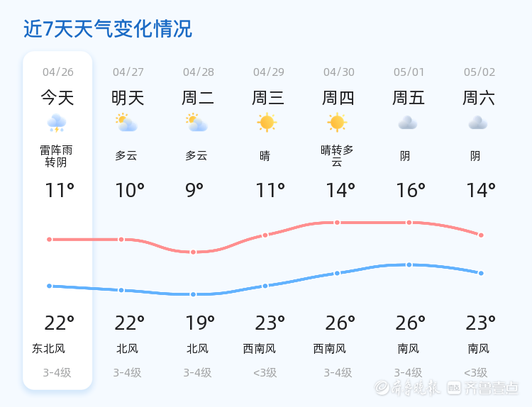 未来三天(4月27日至29日),德州天气以多云为主,气温逐渐回升,最高气温可达23℃,最低气温9℃。风力方面,北风为主,未来三天风力适中。提醒市民根据气温变化适时增减衣物,注意防晒和防风。