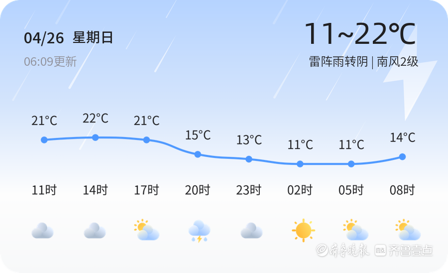 今天是4月26日,星期日,农历三月初十。德州地区今日天气为雷阵雨转阴,气温介于11℃至22℃之间,南风2级,空气湿度71%,PM2.5指数42,空气质量良好。各区天气情况基本一致,均为雷阵雨转阴,市民出行请注意携带雨具。