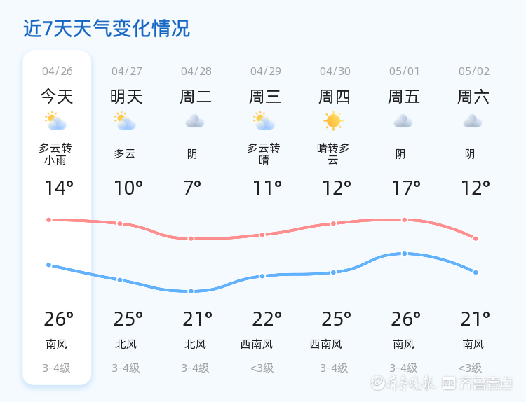今日是农历三月初十,星期日,济宁市迎来多云转小雨的天气,气温适宜,全市大部分地区最高气温26℃,最低气温14℃。目前,市区气温13.9℃,东南风2级,空气湿度82%,PM2.5指数为60,空气质量良好。