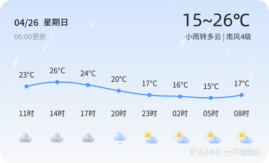 今日是4月26日,农历三月初十,济南迎来小雨转多云的天气,南风4级,空气质量为良(PM2.549)。当前温度为19.1℃,早晨有小雨,预计白天逐渐转为多云。市民出行请注意携带雨具,雨天路滑,驾车需减速慢行。南风较大,建议市民关闭好门窗,防止高空坠物。明后两天济南将有大风天气,气温波动较大,最低气温为10℃,最高气温为26℃。章丘区气象台已发布大风黄色预警信号,预计当前至明天南大风持续,阵风可达9级以上。市民需注意防范大风带来的不利影响,尽量减少户外活动,妥善安置易受大风影响的物品。此外,市民还需注意天气变化,及时增减衣物,防范感冒等疾病的发生。未来一周济南气温逐渐回升,风力减弱,建议市民根据天气情况合理安排出行,大风天气减少外出,注意安全。