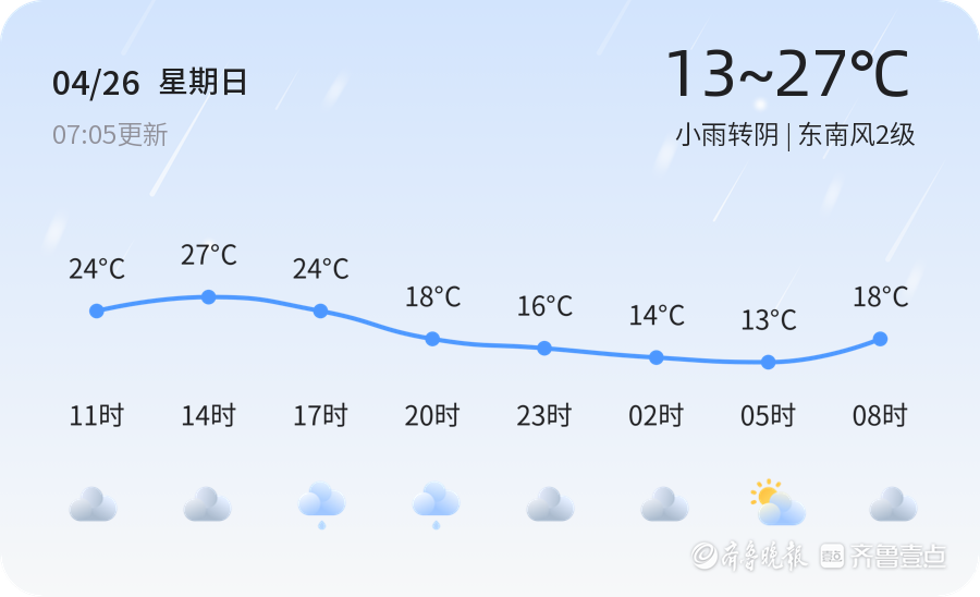今天是4月26日,星期日,农历三月初十。潍坊市今日天气为小雨转阴,气温介于13℃至27℃之间,东南风2级,空气湿度65%。PM2.5指数为70,空气质量等级为良好。市民出行时建议携带雨具,注意交通安全。